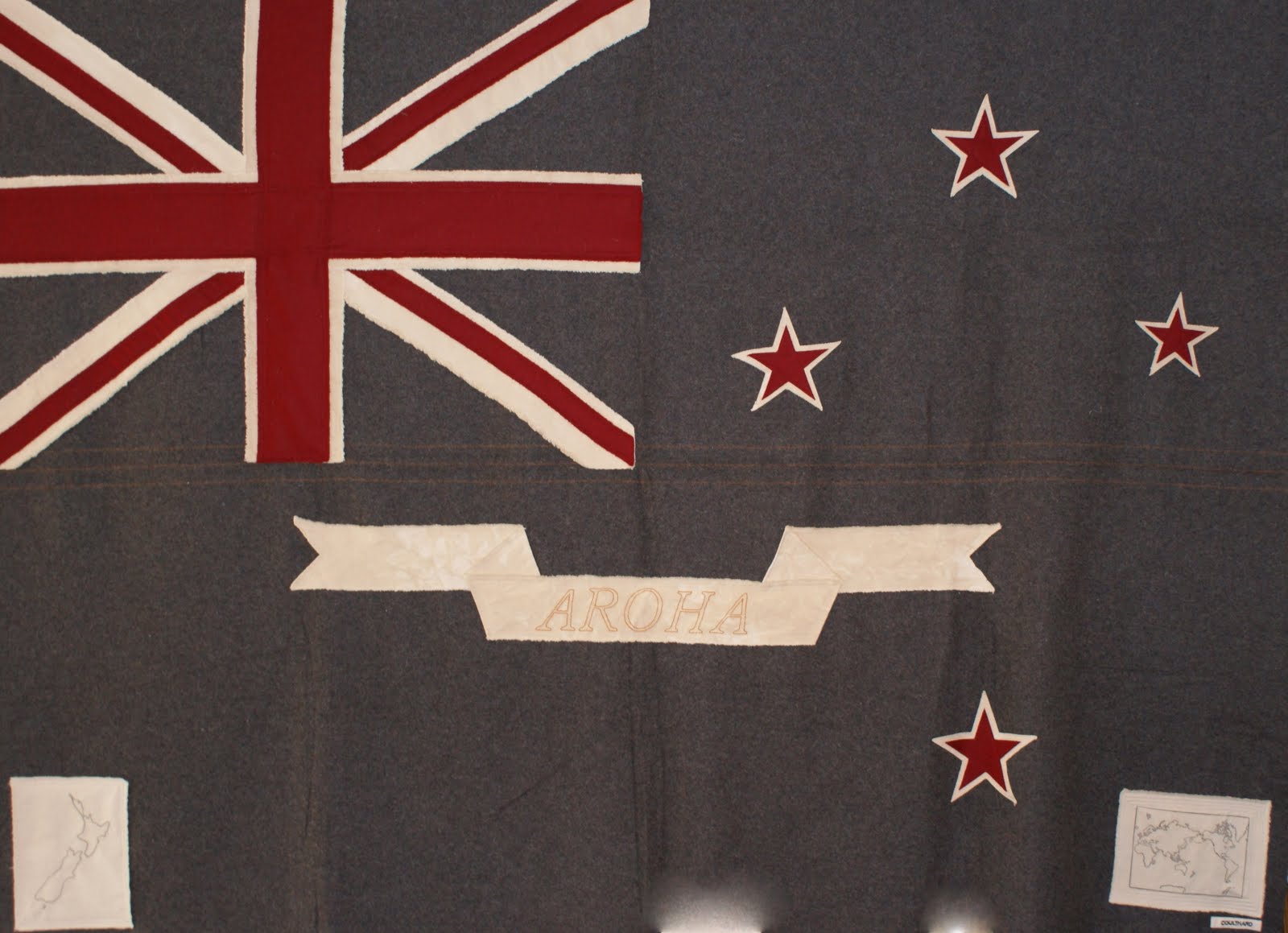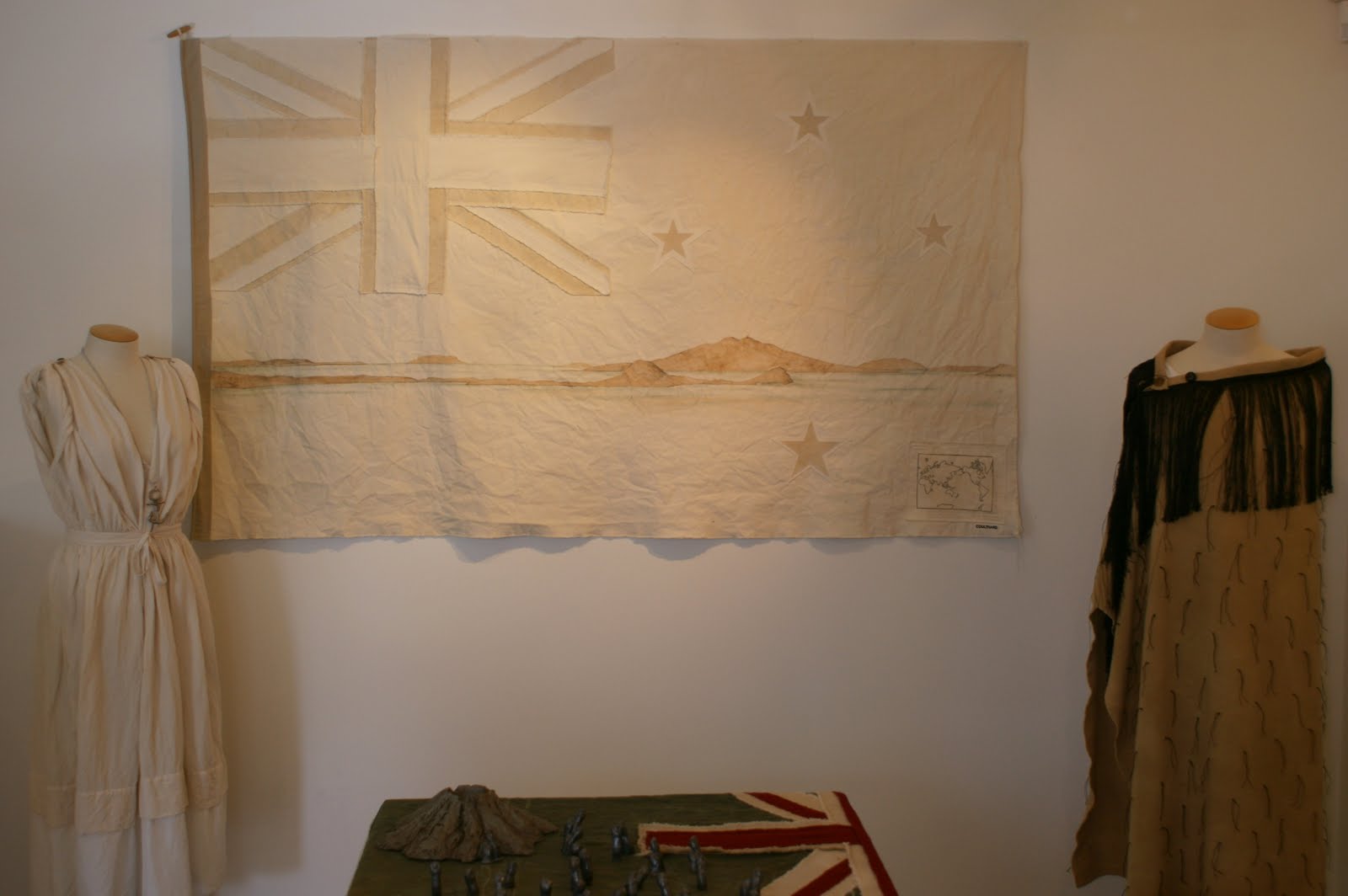 My exhibition “Rugged and Ragged” at Native Agent is nearly over. It has been a great experience with lots of wonderful feedback. The Exhibition consists of Flags, Rugs and Rags all inspired by New Zealand history. My favourite piece was the shadow light box called Te Atatu, The Dawn (detail below). I love the dreamlike quality and the way the veil brought the shadows to life with its movement.