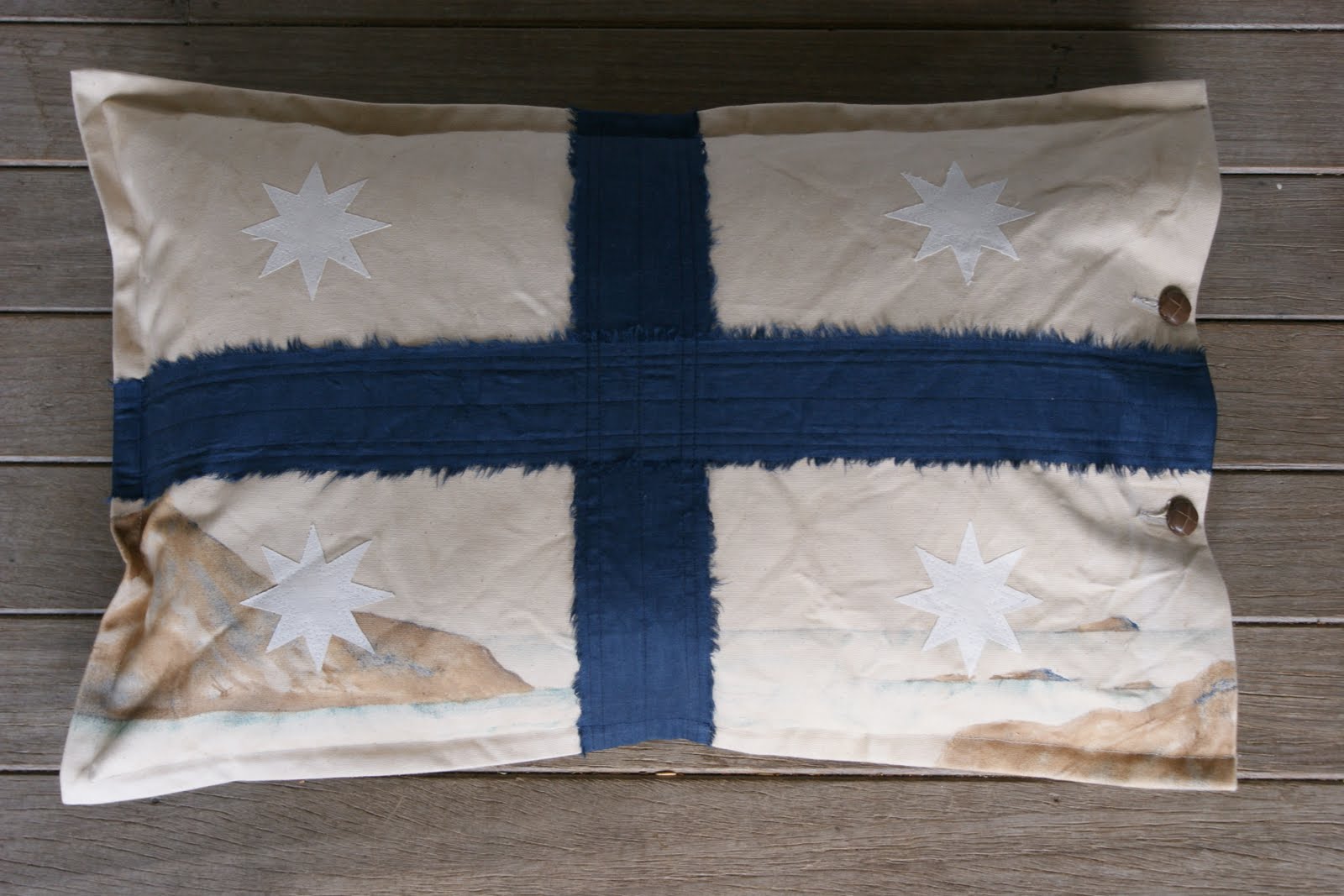 My exhibition “Rugged and Ragged” at Native Agent is nearly over. It has been a great experience with lots of wonderful feedback. The Exhibition consists of Flags, Rugs and Rags all inspired by New Zealand history. My favourite piece was the shadow light box called Te Atatu, The Dawn (detail below). I love the dreamlike quality and the way the veil brought the shadows to life with its movement.